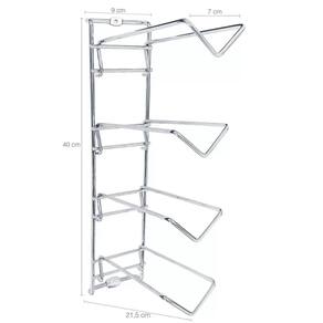 Garantia: 90 dias / Peso total: 1,460Kg / Cor predominante: cromado / Ref: 7794463734192 Dimensões de cada: 7cm (C) x 21,5cm (L) x 40cm (A); Dimensões para encaixe da garrafa: 7cm; Distancia entre parafusos: 40cm; Capacidade: 4 garrafas cada suporte; Material: aço cromado. Conteúdo: 2 adegas para parece; Cuidados: - Pano levemente umedecido com água, seguido de pano seco; - Não utilizar produtos químicos ou abrasivos na limpeza; - Evitar batidas e o contato com objetos cortantes; Detalhes do produto: - Os suportes onde os vinhos ficam encaixados são extremamente firmes e robustos, mas caso seja de seu interesse é possível que você os movimente como dobradiças; - Por ocupar pouco espaço em sua parede, você pode colocar varias adegas iguais a essa, uma ao lado da outra e aumentar ainda mais sua carta de vinhos; - Possui uma camada extra de protetivo aplicado sobre o cromo que proporciona grande resistência à corrosão; - Ideal para uso doméstico, esta adega também se destaca em restaurantes, bares, pubs e bistrôs.