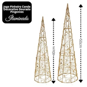 O kit inclui 2 árvores iluminadas em tamanhos diferentes (50cm e 40cm), confeccionadas em estrutura metálica aramada no formato de cone e decoradas com miçangas douradas e mini bolinhas cristal, que refletem a luz e criam um efeito luminoso sofisticado. Cada árvore possui fio LED branco quente, alimentado por pilhas, garantindo iluminação suave e acolhedora — perfeita para decorar salas, mesas, aparadores ou vitrines.