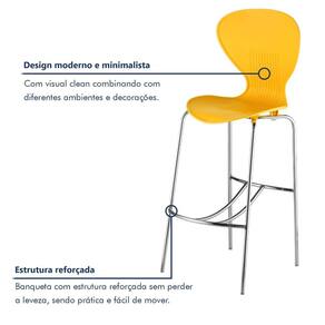É uma banqueta de plástico com encosto para área gourmet? Sim, seu assento em polipropileno e encosto anatômico oferecem conforto mesmo em uso prolongado. Acabamento da Estrutura: Cromado Altura do assento até o chão: 71 cm Altura do Encosto: 39 cm Altura Regulável: Não Ambiente Principal: Cozinha codigo_ean: 7900288222817 Cor: Amarelo Cor do Produto: Amarelo Dobrável: Não Escala de Brilho: Semi-Fosco Informações Complementares: Por se tratar de produto injetado, pequenas variações de tonalidade de cor são intrínsecas ao produto, e não podem ser consideradas defeito. Para aprimoramento de projeto, Itens Inclusos: 2 Banquetas Linha ou Coleção: Flash Marca: Prima Design Material do Assento: Polipropileno Material do Encosto: Polipropileno Necessita Montagem: Não Origem do Produto: Nacional Peso: 9,2 kg Possui Almofada no Assento: Não Possui Apoio Para os Pés: Sim Possui Encosto: Sim Possui Rodízio: Não Recomendações de Uso, Manutenção e Limpeza: A estrutura deve ser limpa utilizando pano seco de algodão ou flanela. Se necessário, utilize pano umedecido apenas com água, secando o móvel em seguida. Não utilize solvente, álcool, acetona, lustra móveis, produtos abrasivos e outros produtos que contenham soda e ou ácidos para limpar e tirar manchas dos móveis. Não expor os móveis à luz solar e ambientes com umidade relativa elevada. Tipo de Assento: Fixo Tipo de Encosto: Fixo Marca: Não Informado