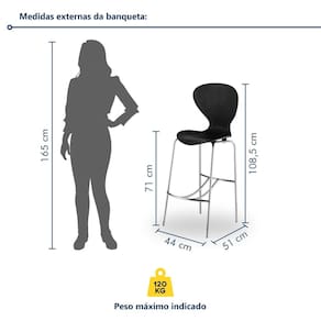É uma banqueta de plástico com encosto para área gourmet? Sim, seu assento em polipropileno e encosto anatômico oferecem conforto mesmo em uso prolongado. Acabamento da Estrutura: Cromado Altura do assento até o chão: 71 cm Altura do Encosto: 39 cm Altura Regulável: Não Ambiente Principal: Cozinha codigo_ean: 7900288222879 Cor: Preto Cor do Produto: Preto Dobrável: Não Escala de Brilho: Semi-Fosco Informações Complementares: Por se tratar de produto injetado, pequenas variações de tonalidade de cor são intrínsecas ao produto, e não podem ser consideradas defeito. Para aprimoramento de projeto, Itens Inclusos: 2 Banquetas Linha ou Coleção: Flash Marca: Prima Design Material do Assento: Polipropileno Material do Encosto: Polipropileno Necessita Montagem: Não Origem do Produto: Nacional Peso: 4,6 kg Possui Almofada no Assento: Não Possui Apoio Para os Pés: Sim Possui Encosto: Sim Possui Rodízio: Não Recomendações de Uso, Manutenção e Limpeza: A estrutura deve ser limpa utilizando pano seco de algodão ou flanela. Se necessário, utilize pano umedecido apenas com água, secando o móvel em seguida. Não utilize solvente, álcool, acetona, lustra móveis, produtos abrasivos e outros produtos que contenham soda e ou ácidos para limpar e tirar manchas dos móveis. Não expor os móveis à luz solar e ambientes com umidade relativa elevada. Tipo de Assento: Fixo Tipo de Encosto: Fixo Marca: Não Informado