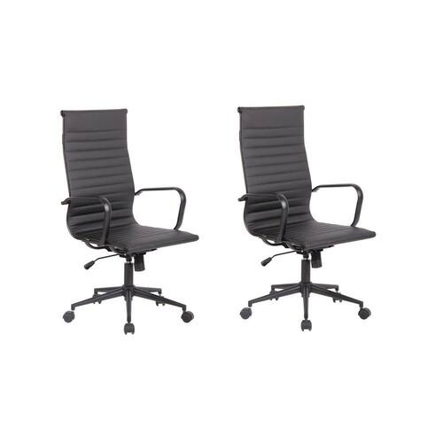 Conjunto com 2 Cadeiras de escritório com estrutura em aço pintado à pó preto, revestimento em poliuretano (PU), com encosto alto. Possui base giratória em aço pintado à pó preto e rodizíos em nylon. Possui ajuste de altura (mín 105cm e máx 115cm) e sistema relax.
