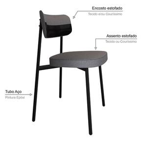 Material Principal Composição: Aço/Madeira Multilaminada/MDP/Espuma/TecidoMaterial da Estrutura Pés: AçoAcabamento Estrutura: Epóxi-PóTipo de Encosto: Fixo AnatômicoMaterial Estrutura do Encosto: Madeira MultilaminadaEnchimento Encosto: Espuma D-22Revestimento do Encosto: TecidoTipo do Assento: FixoMaterial Estrutura do Assento: MDPEnchimento Assento: Espuma D-28Revestimento do Assento: TecidoPossui Braços: NãoTipo: CadeiraModelo: FixoEmpilhável: NãoDobrável: NãoAmbiente Principal: Sala de Estar JantarEstilo: ContemporâneoSuporta Até (kg): 120 kgRecomendações de Uso, Manutenção e Limpeza: Para a limpeza, utilize flanela seca ou pano macio levemente umedecido em água. Utilize um pano seco em seguida. Evite contato com produtos químicos (solventes, thinner, acetona, etc) e não utilize nenhum tipo de esponja de aço.Necessita de Montagem: Sim Acompanha Manual de MontagemComplexidade da Montagem: Média: pode ser montado por mais de uma pessoa e/ou necessite de maior conhecimento para montagem.