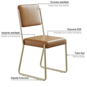 Linha: Sala de Jantar | Comprimento: 46 | Profundidade: 52 | Altura: 87 | Altura do Assento até o chão: 49 | Altura do Encosto até o chão: 56.5 | Dimensões do Assento: 43,5x44x8cm | Dimensões do Encosto: 42,5x30,5x3,7cm | Peso Líquido: 11.9 | Material Principal Composição: Aço/MDP/Espuma/Tecido | Material da Estrutura Pés: Aço | Acabamento Estrutura: Epóxi-Pó | Tipo de Encosto: Fixo | Material Estrutura do Encosto: Aço | Enchimento Encosto: Espuma D-22 | Revestimento do Encosto: Courino | Tipo do Assento: Fixo | Material Estrutura do Assento: MDP | Enchimento Assento: Espuma D-28 | Revestimento do Assento: Courino | Possui Braços: Não | Tipo: Cadeira | Modelo: Fixo | Empilhável: Não | Dobrável: Não | Ambiente Principal: Sala de Estar Jantar | Estilo: Contemporâneo | Suporta Até (kg): 120kg | Requer montagem: | Altura da cadeira: | Profundidade do assento: | Quantidade de cadeiras por conjunto: | Largura do assento: | Inclui manual de montagem: | Marca: