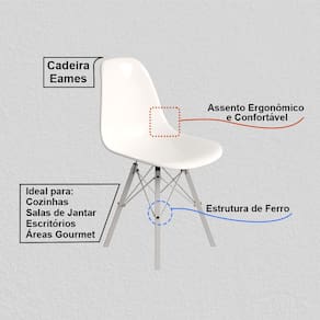 Características: Modelo: Cadeira Eames Material da Estrutura: Ferro Cor da Estrutura: Branco Material do Assento: Polipropileno Cor do Assento: Branco Design moderno e funcional