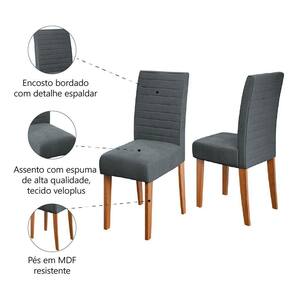 Importante sobre a : A é realizada até a portaria ou porta de entrada do indicado, desde que o acesso seja permitido. Para locais com portaria, a será feita no piso térreo. Não realizamos montagem, desmontagem, por escadas ou içamento. É responsabilidade do cliente verificar se as dimensões do produto são compatíveis com portas, elevadores e corredores. Evite imprevistos: confira todos os detalhes antes de concluir sua compra. MEDIDAS:: [ A ] = 92 cm [ L ] = 42 cm [ P ] = 60 cm | PESO:: 7,25Kg (cada) | PESO SUPORTADO:: 110 Kg cada | MODELO:: Conjunto 2 Cadeiras Estofada Sala de Jantar Creta | MARCA:: Dobuê | ESTRUTURA:: MDF | ACABAMENTO:: Veluplus | REVESTIMENTO ASSENTO E ENCOSTO:: Espuma D20 | PÉS:: Sapatas Plásticas | TECIDO:: Veluplus | DIFERENCIAL:: Material em MDF de alta resistência, com assento e encosto acolchoados, tecido Veluplus. | SISTEMA DE MONTAGEM:: Parafusos e porcas cilíndricas | ITENS INCLUSOS:: 2 cadeiras, 1 manual de montagem e 1 kit parafusos | INSTRUÇÕES E CUIDADOS:: Limpar com pano levemente umedecido com água, não utilizar produtos abrasivos | GARANTIA:: 3 meses pelo fabricante. | AVISO: Importante sobre a : A é realizada até a portaria ou porta de entrada do indicado, desde que o acesso seja permitido. | Altura da cadeira: 92 | Inclui manual de montagem: sim | Largura do assento: 42 | Profundidade do assento: 60 | Quantidade de cadeiras por conjunto: 2 | Requer montagem: sim | Cor: Madeirado/Grafite Marca: Não Informado