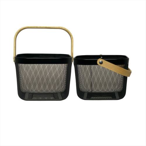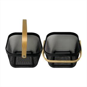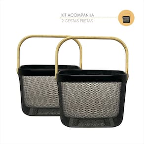 Cesta Organizador em Tela Metálica Preta com Alça de Madeira - 24,5 x 24,5 x 18 cmOrganize com charme, ventile com praticidade e decore com estiloA Cesta Organizadora em Tela Metálica com Alça de Madeira é o item perfeito para quem busca unir funcionalidade com design contemporâneo. Fabricada com estrutura metálica resistente e acabamento em pintura preta fosca, esta cesta proporciona um visual sofisticado e ao mesmo tempo discreto - ideal para compor diferentes ambientes da casa com harmonia e personalidade.Características Técnicas:Material do corpo: Tela metálica em aço com pintura eletrostática acabamento fosco, durável e resistente à corrosão .Material das alças: Madeira natural envernizada acabamento suave ao toque, com efeito visual quente e acolhedor .Dimensões:24,5 cm largura 24,5 cm profundidade 18 cm altura Vantagens e Aplicações:Organização multifuncional: ideal para armazenar toalhas de mão, rolos de papel, cosméticos, sabonetes, acessórios de cabelo, temperos, pacotes de alimentos, potes de mantimentos, talheres, panos de prato, entre outros.Estilo versátil: combina perfeitamente com banheiros modernos, cozinhas abertas, lavanderias planejadas, home offices, espaços gourmet ou prateleiras decorativas.Boa ventilação: a estrutura vazada de tela permite a circulação de ar, ideal para produtos que precisam respirar, como esponjas, alimentos secos ou tecidos.Fácil de transportar: as alças de madeira anatômicas facilitam o manuseio mesmo quando a cesta está cheia.Visual decorativo: o contraste entre o metal preto e a madeira clara oferece um toque natural e elegante à decoração.Images IlustrativasDica de uso:Monte um conjunto com outras cestas similares e crie um sistema de organização modular. Combine com etiquetas ou tags para uma organização ainda mais eficiente e charmosaEssencial para quem valoriza ambientes organizados, funcionais e visualmente agradáveis.Com esta cesta, até as pequenas tarefas do dia a dia ganham um toque de bom gosto e praticidade.