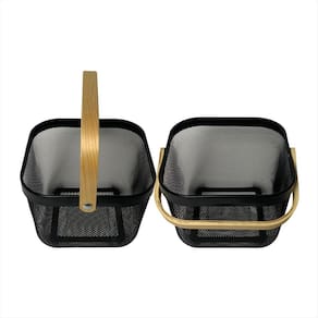 Cesta Organizador em Tela Metálica Preta com Alça de Madeira - 24,5 x 24,5 x 18 cmOrganize com charme, ventile com praticidade e decore com estiloA Cesta Organizadora em Tela Metálica com Alça de Madeira é o item perfeito para quem busca unir funcionalidade com design contemporâneo. Fabricada com estrutura metálica resistente e acabamento em pintura preta fosca, esta cesta proporciona um visual sofisticado e ao mesmo tempo discreto - ideal para compor diferentes ambientes da casa com harmonia e personalidade.Características Técnicas:Material do corpo: Tela metálica em aço com pintura eletrostática acabamento fosco, durável e resistente à corrosão .Material das alças: Madeira natural envernizada acabamento suave ao toque, com efeito visual quente e acolhedor .Dimensões:24,5 cm largura 24,5 cm profundidade 18 cm altura Vantagens e Aplicações:Organização multifuncional: ideal para armazenar toalhas de mão, rolos de papel, cosméticos, sabonetes, acessórios de cabelo, temperos, pacotes de alimentos, potes de mantimentos, talheres, panos de prato, entre outros.Estilo versátil: combina perfeitamente com banheiros modernos, cozinhas abertas, lavanderias planejadas, home offices, espaços gourmet ou prateleiras decorativas.Boa ventilação: a estrutura vazada de tela permite a circulação de ar, ideal para produtos que precisam respirar, como esponjas, alimentos secos ou tecidos.Fácil de transportar: as alças de madeira anatômicas facilitam o manuseio mesmo quando a cesta está cheia.Visual decorativo: o contraste entre o metal preto e a madeira clara oferece um toque natural e elegante à decoração.Images IlustrativasDica de uso:Monte um conjunto com outras cestas similares e crie um sistema de organização modular. Combine com etiquetas ou tags para uma organização ainda mais eficiente e charmosaEssencial para quem valoriza ambientes organizados, funcionais e visualmente agradáveis.Com esta cesta, até as pequenas tarefas do dia a dia ganham um toque de bom gosto e praticidade.