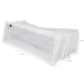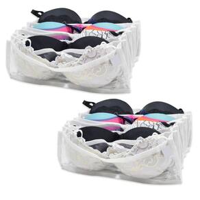 Garantia: 90 dias / Peso total: 120g / Cor predominante: branco e transparente / Referência: 7794462952849; Dimensões de cada colmeia: 31cm (C) x 20cm (L) x 10cm (A); Divisão: 6 nichos cada; Comporta: 6 sutiãs cada; Conteúdo: 2 colmeias organizadoras; Materiais: plástico e TNT.