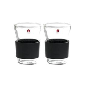 O copo HotCool da iittala é ideal para bebidas quentes e frias. A cinta plástica que envolve o vidro proporciona um toque agradável às mãos e tem função isolante.