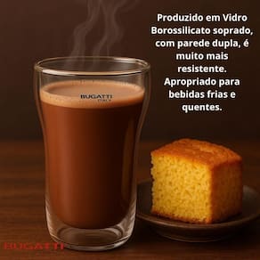 Produzido em Vidro Borossilicato soprado, com parede dupla, é muito mais resistente. Apropriado para bebidas frias e quentes.