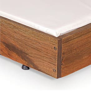 É construída em madeira maciça de eucalipto, e o acabamento é feito com STAIN na tonalidade Nogueira. Esse tipo de acabamento não forma filme, permitindo que a madeira trabalhe de acordo com as condições climáticas, além de possuir proteção UV e hidrorepelente. Acompanha almofada em tecido Acquablock cru.