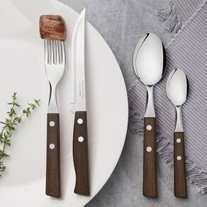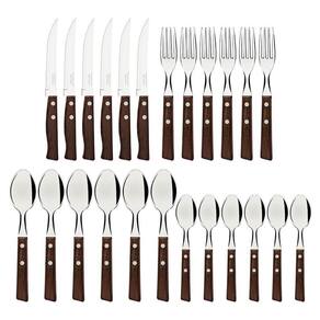 INFORMAÇÕES DO FAQUEIRO TRAMONTINA 24 PEÇAS COM LAMINAS DE AÇO INOX E CABOS DE MADEIRA - Lâminas de aço inox. - As lâminas das facas têm maior durabilidade do fio devido ao tratamento térmico. - As lâminas do garfo e colher contam com maior espessura e uma estampagem do aço que garante maior resistência, evitando deformações. - Cabos de madeira natural com rebites de alumínio.