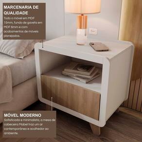 O Conjunto 2 Mesas de Cabeceira Mabel une design moderno, praticidade e acabamento de alto padrão, trazendo para o quarto o mesmo padrão de qualidade dos móveis planejados. Produzidas em 100% MDF com revestimento BP e fita de borda PVC 0,045cm, oferecem durabilidade, resistência e sofisticação. Cada mesa possui 1 gaveta ampla e 1 nicho aberto, perfeitos para organizar livros, objetos pessoais ou apoiar luminárias e itens decorativos. Com pés robustos e acabamento refinado, são peças versáteis que combinam facilmente com cabeceiras, camas e guarda-roupas em tons amadeirados, brancos ou cinza. Com 55 cm de altura, são ideais para garantir funcionalidade e elegância ao lado da cama. Acabamento da Gaveta: Melamínico Acabamento dos Pés: Melamínico Altura dos Pés: 11,5 cm Ambiente Principal: Quarto Complexidade da Montagem: Média: pode ser montado por mais de uma pessoa e/ou necessite de maior conhecimento para montagem Cor: Branco/ Louro Freijó Grann Cor do Produto: Branco/ Louro Freijó Grann Cor Flex: Não Cor Interna: Branco Escala de Brilho: Fosco Escala de Brilho da Gaveta: Fosco Gaveta com Chave: Não Informações Complementares: Limpar somente com um pano levemente umedecido. Indicado para ambientes internos. Itens Inclusos: 2 Mesas de Cabeceira, Kits Ferragens e Manual de Montagem Linha ou Coleção: Mabel Manual de Montagem e Instalação: https://product-hub-prd.madeiramadeira.com.br/200458218/documents/d7146c0b-02bf-4542-8431-7722b124ba9c3106044657817538823513136.pdf Marca: FD Material da Gaveta: MDF Material dos Pés: MDF Material Principal: MDF Montagem Flex: Não Necessita Montagem: Sim Origem do Produto: Nacional Pés Reguláveis: Não Peso: 15 kg Peso Máximo por Gaveta: 5 kg Pet Friendly: Não Possui Espelho: Não Possui Possui Nichos: 02 Possui Pés: 08 Possui Portas: Não Possui Prateleiras: Não Possui Vidro: Não Quantidade de Nichos: 02 Recomendações de Uso, Manutenção e Limpeza: Limpar somente com um pano levemente umedecido. Indicado para ambientes internos Sapatas Niveladoras: Não Sistema de Montagem: Parafusos, cavilhas e minifix Suporta Até (kg): 5 kg Tipo de Corrediça da Gaveta: Metálica Telescópica Tipo de Puxador da Gaveta: Embutido