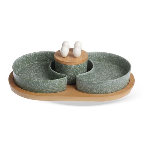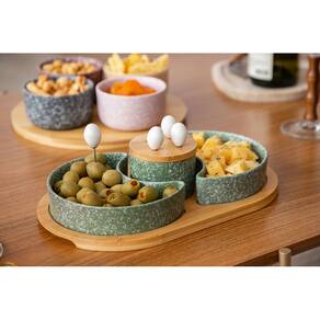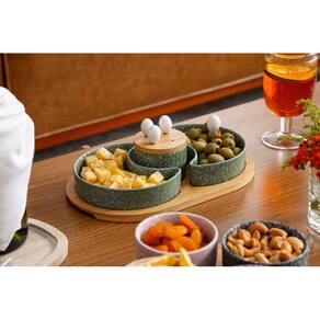 Leve mais charme, organização e funcionalidade para seus momentos à mesa com este conjunto de petisqueiras em porcelana verde estilo granito com tábua em bambu, unindo beleza e praticidade em cada detalhe.