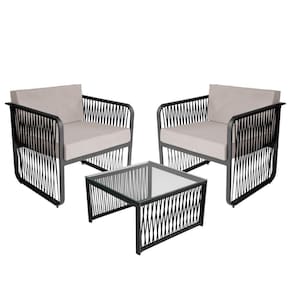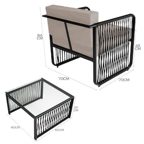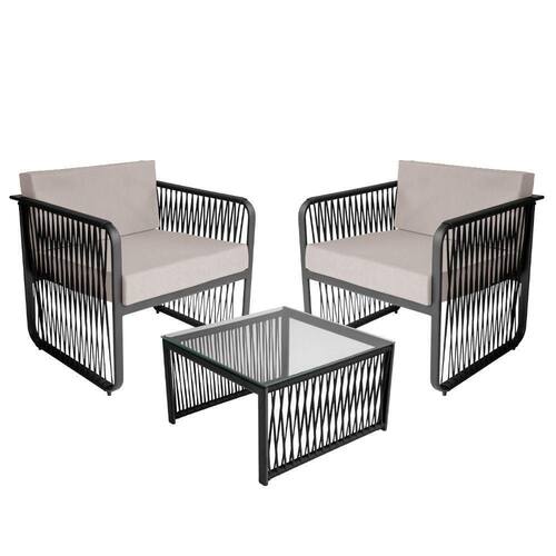Conjunto 2 Poltronas E Mesa Centro Corda Náutica Santiago Preto/branco Leve conforto e sofisticacao para sua area externa com o Conjunto Santiago, composto por 2 Poltronas e 1 mesa de centro. Seu design moderno e acabamento artesanal garantem elegancia e durabilidade, tornando qualquer espaco mais acolhedor e funcional. Produzido em aluminio resistente, acabamento artesanal em corda nautica e tampo de vidro elegante. Este conjunto e ideal para compor espacos externos com charme e aconchego.
