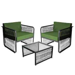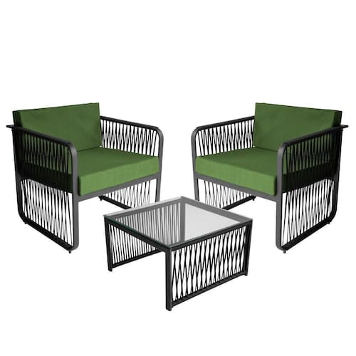 Conjunto 2 Poltronas E Mesa Centro Corda Náutica Santiago Preto/verde Leve conforto e sofisticacao para sua area externa com o Conjunto Santiago, composto por 2 Poltronas e 1 mesa de centro. Seu design moderno e acabamento artesanal garantem elegancia e durabilidade, tornando qualquer espaco mais acolhedor e funcional. Produzido em aluminio resistente, acabamento artesanal em corda nautica e tampo de vidro elegante. Este conjunto e ideal para compor espacos externos com charme e aconchego.