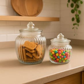 Leve mais charme e funcionalidade para sua cozinha ou cantinho gourmet com o jogo de Potes Baleiro em Vidro Canelado com Tampa Hermética. Com capacidade de 1,4 litros e 600ml, eles são ideais para armazenar doces, balas, biscoitos, grãos, temperos ou o que preferir, mantendo tudo sempre fresco e visível.