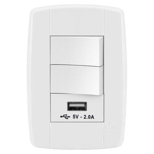 Linha Modular Ilumi Lev Conjunto Completo e Desmontado com: 1 Módulo de Tomada USB - 5V - 2.0A 2 Módulos de Interruptor Simples 1 Placa 4X2 com suporte para 3 Módulos 2 Parafusos Para montar é fácil, apenas um click. só encaixar