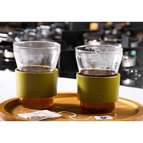 O copo HotCool da iittala é ideal para bebidas quentes e frias. A cinta plástica que envolve o vidro proporciona um toque agradável às mãos e tem função isolante.