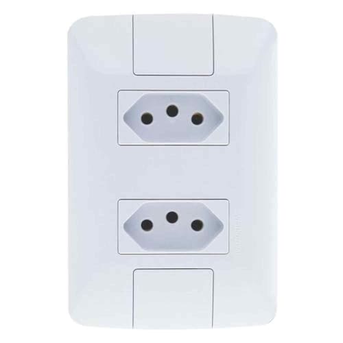 - Conjunto com 2 tomadas 10A - Fabricadas em termoplástico com acabamento brilho na cor branca - Sistema modular com suporte incorporado na placa - Furo oblongo para facilitar a fixação e a regulagem da placa à parede - Furos para fixação em parede de madeira - Fixação não aparente - Bornes travados por parafusos para melhor fixação dos condutores