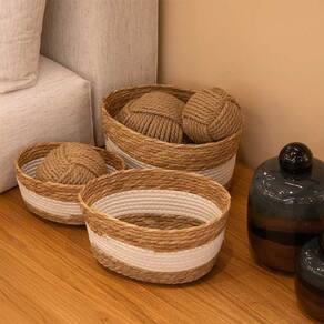 Conjunto 3 Cestos Decorativos em Fibra Vegetal e Algodão Branco