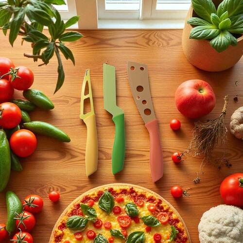Conjunto 3 Facas Coloridas Para Queijo Lamina Antiaderente Conjunto 3 Facas Coloridas para Queijo - Lâmina Antiaderente Leve mais praticidade, estilo e eficiência para a sua mesa Com design moderno e colorido, esse conjunto é ideal para cortar todos os tipos de queijo com precisão. As lâminas antiaderentes evitam que o queijo grude, facilitando o corte e deixando sua experiência ainda melhor. 3 facas específicas para diferentes tipos de queijo Lâminas com revestimento antiaderente Cabos ergonômicos e confortáveis Cores vibrantes que decoram e facilitam a identificação