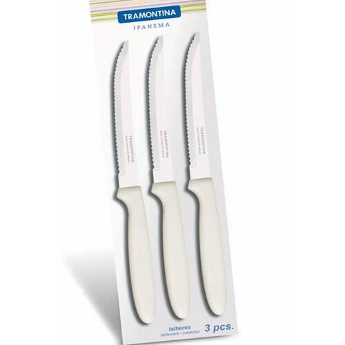 Conjunto Facas Inox 3 Peças Branco Ipanema Tramontina 23360385Os talheres da linha Ipanema são próprios para as refeições diárias. Despojados, têm nas diferentes opções de cores dos cabos de polipropileno o toque de alegria que vai à mesa. As facassão de aço inox em espessuras que garantem alta resistência e durabilidade. O formato das lâminas impede deformações e o tratamento térmico dá vida longa ao fio. Podem ser levados à máquina de lavar.Cor: Branco