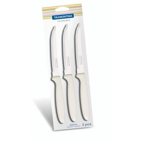 Conjunto Facas Inox 3 Peças Branco Ipanema Tramontina 23360385 Os talheres da linha Ipanema são próprios para as refeições diárias. Despojados, têm nas diferentes opções de cores dos cabos de polipropileno o toque de alegria que vai à mesa. As facassão de aço inox em espessuras que garantem alta resistência e durabilidade. O formato das lâminas impede deformações e o tratamento térmico dá vida longa ao fio. Podem ser levados à máquina de lavar. Cor: Branco Ean: 7891112045699