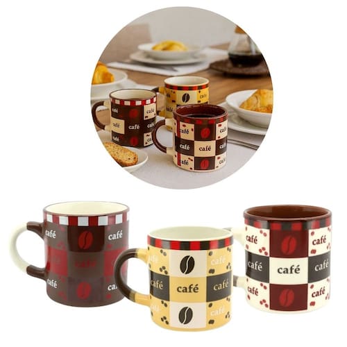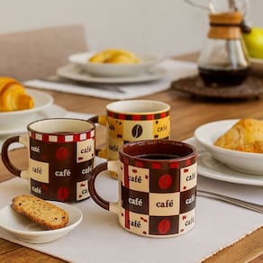 Decore com charme e personalidade ou sirva o seu café com um toque especial com o Conjunto de Mini Canecas em Cerâmica Modelo Pilão. Cada peça apresenta um design quadriculado com estampas de grãos de café e a palavra "Café" em destaque, tudo em uma harmoniosa combinação de cores marrom, creme e amarelo, que remete ao estilo tradicional e acolhedor das cozinhas brasileiras.