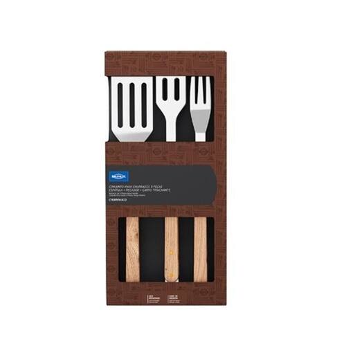 Receba a família e os amigos no final de semana com um churrasco preparado com os utensílios corretos, pratícos e resistentes para que seus convidados aproveitem o almoço ou jantar da melhor forma possível. Este conjunto de 3 peças para churrasco, é formado por três peças: 1 espátula, 1 pegador e 1 garfo, com lâmina em aço inox e cabo de madeira fixado por rebites de alumínio, resistentes e trazendo um aspecto rústico à sua casa. Além disso, as peças do conjunto podem ser penduradas e compor a decoração da sua cozinha. Medidas: 01 Espátula 39x7x1,5 cm Pegador 40x5x5 cm Garfo 42,5x2,5x1,5 cm Ficha técnica - Cor: Inox Ean: 7896502840588