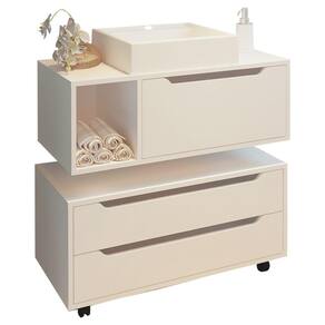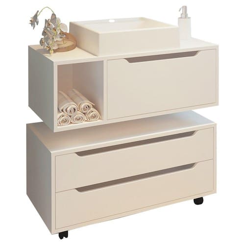 Conjunto 3 Peças Para Banheiro BN3600X43X44, uma ótima opção para quem busca por um banheiro elegante e cheio de personalidade. Gabinete e Balcão com estrutura em MDP de 15mm, proporcionando maior durabilidade e resistência, contando com acabamento em pintura UV (semi - brilho). Gabinete composto por 1 porta com articulador e dobradiças metálicas e 1 nicho lateral para armazenar itens. Suportando 10kg o tampo e 3kg o nicho. Balcão composto por 2 gavetas com frente usinada e corrediças metálicas, acompanha 4 rodízios. Suportando 15kg o tampo e 3kg cada gaveta. Cuba produzida em mármore sintético, contando com acabamento em brilho polido. Suportando até 4 litros e 10kg. Possui furação para instalação de torneira (torneira não inclusa). Unindo elementos do design contemporâneo, que proporcionam uma ambientação intimista e com acabamentos refinados. Estes móveis chegarão na sua casa separados em 3 volumes.