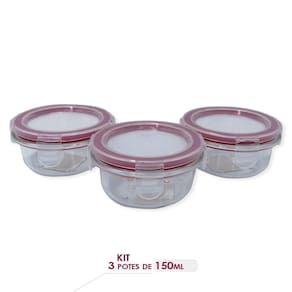 Conjunto 3 Potes De Vidro Com Tampa Hermética Redondo150ml Conjunto 3 Potes De Vidro Com Tampa Hermética Redondo 150ml Esse conjunto de potes é perfeito para armazenar ou preparar alimentos, com tampa hermética proporciona um ótimo fechamento, auxiliando numa maior durabilidade do conteúdo. alta resistência térmica, pode ser utilizado no microondas ou freezer. Produzido em vidro Borossilicato assegura uma elevada durabilidade e resistência aos choques térmicos. ESPECIFICAÇÕES:- Material: Vidro Borossilicato e Plástico - Dimensões: 9,5cm diâmetro x 4,8cm altura - Cor: Vidro transparente / Tampa com vedação vermelha - Capacidade: 150ml- Quantidade: 03 unidades- Resistente à temperaturas: Forno 450ºC / Freezer -40ºC- Formato: Redondo ATENÇÃONão levar direto do freezer para o forno;Não colocar o recipiente quente em contato com água fria;Não leve a tampa plástica ao forno;Abra a tampa quando levar ao microondas. CONTÉM:- 01 Kit com 3 Potes em Vidro com tampa Hermética 150ml Redondos Ean: 7899755653264