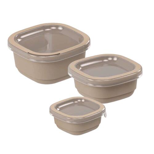 Com capacidades aproximadas de 250 ml, 550 ml e 1L, tampas herméticas em borracha cinza, alças laterais e design modular que otimiza espaço em armários, são ideais para utensílios ou mantimentos diários.
