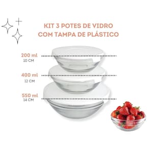 Conjunto 3 Potes Tigela De Vidro 200ml 400ml 550ml Tampa E Trava Branca De Plástico Armazenar Comida Geladeira Salada