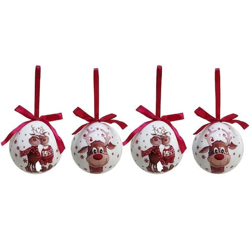 Deixe sua árvore ainda mais encantadora com este conjunto de 4 bolas natalinas decoradas, no modelo laqueado branco com estampa premium de casal de renas e rena feliz. Cada bola vem finalizada com laço vermelho e fita para pendurar, proporcionando charme e praticidade na montagem da sua decoração.