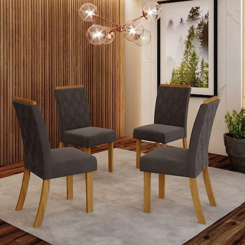 O conjunto de Cadeiras Estofadas Lupita é o que você precisa para dar aquele toque de sofisticação e requinte que você tanto quer em sua sala de jantar. Desenvolvida com pés em MDF de 25mm, sendo que a fixação é feita com peças de metal, que garantem maior segurança e durabilidade ao móvel Com Altura de 950mm, Largura de 440 e Profundidade de 575mm. Possui moldura usinada para pega no encosto, evitando assim o contato direto das mãos com o tecido. O encosto tem uma inclinação ideal e o estofado é com espuma de 10 mm e densidade D15, já o acento é com espuma de 30mm e densidade D23 com tecido suede bordado que proporciona maior conforto e delicadeza para todos os momentos especial com a sua família e amigos.