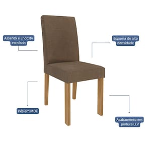 O Conjunto de Cadeiras Maia é perfeito para complementar sua sala de jantar, oferecendo estrutura resistente em MDF com acabamento em pintura UV. O assento e encosto são revestidos em tecido linho e espuma de alta densidade garantindo aconchego e durabilidade. Com pés em MDF e capacidade para suportar até 100kg, essas cadeiras são a escolha ideal para quem busca estilo e funcionalidade no dia a dia.