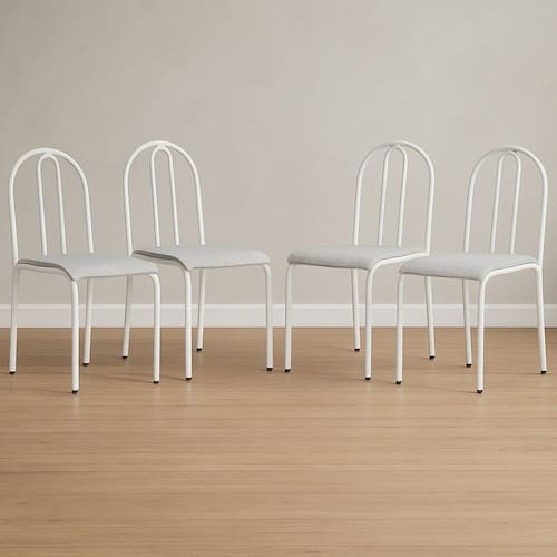 *Podem ocorrer variações de cores nos assentos das cadeiras em relação às fotos.* Acabamento da Estrutura: Pintura Almofada do assento: Fixa Altura do assento até o chão: 44 cm Ambiente Principal: Cozinha codigo_ean: 7908737902037 Complexidade da Montagem: Baixa: pode ser montado por uma pessoa sozinha Cor: Branco/Cinza Cor do Produto: Branco/Cinza Cor dos Pés: Branco Dobrável: Não Escala de Brilho: Brilhante Estrutura do Encosto: Aço Giratória: Não Itens Inclusos: 4 Cadeiras, Kit Ferragens e Manual de Montagem Manual de Montagem e Instalação: https://product-hub-prd.madeiramadeira.com.br/523980916/documents/cf3a76ef-b2ad-4275-9381-360e53983b8a314974165481755710636454.pdf Marca: MBM DECOR Material dos Pés: Aço Material Principal: Aço Necessita Montagem: Sim Origem do Produto: Nacional Peso: 2,9 kg Possui Apoio para Braços: Não Possui Apoio Para os Pés: Não Possui Assento/Encosto Estofados: Possui Somente o Assento Estofado Possui Rodízio: Não Quantidade de Itens: 4 Recomendações de Uso, Manutenção e Limpeza: Limpar com pano úmido. Uso recomendado para adultos e áreas internas. Sistema de Montagem: Já vai com todos parafusos necessários. Necessíta chave Philips. Tipo de Assento: Fixo Tipo de Encosto: Fixo Marca: Não Informado