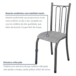 Sim, o aço pintado confere alta resistência e garante maior durabilidade no dia a dia. Ambiente Principal: Sala de Jantar codigo_ean: 7900288269836 Complexidade da Montagem: Baixa: pode ser montado por uma pessoa sozinha Cor: Prata/Preto Cor do Produto: Prata/Preto Escala de Brilho: Semi-Fosco Itens Inclusos: 4 Cadeiras e Kit Ferragens Linha ou Coleção: Amanda Manual de Montagem e Instalação: https://product-hub-prd.madeiramadeira.com.br/482274856/documents/eef45f9a-a2e3-47b8-9a00-3c07d146173f328503873217610722449238.pdf Marca: PAONANDA DECOR Material Principal: Aço Necessita Montagem: Sim Origem do Produto: Nacional Peso: 4,1 kg Quantidade de Itens: 4 Sistema de Montagem: Parafusos Tipo de Encosto: Fixo Marca: Não Informado