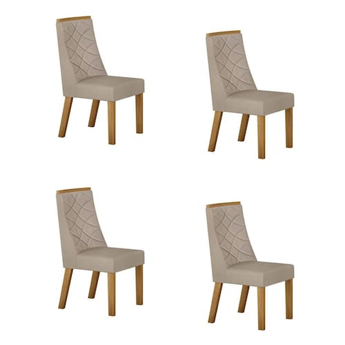 Funcionais e perfeitas para compor os ambientes gourmet da casa, cadeiras são móveis que pedem uma estrutura aconchegante e design lindo, tudo o que você encontra no Conjunto Aurora. Além do assento com enchimento em espuma que proporciona mais comodidade durante as atividades, as 4 peças também têm revestimento em tecido macio ao toque e cor fácil de harmonizar com o restante do mobiliário. Tudo isso contribui para que você possa curtir muito mais com seus convidados ou familiares e desfrutar de um lar-style cativante, sobrando apenas a tarefa de escolher a mesa certa para acompanhar o kit.