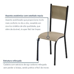 A Cadeira Mariana une resistência, praticidade e estilo em um único produto. Seu encosto em detalhe trançado garante um design moderno e diferenciado, enquanto a estrutura em aço pintado oferece firmeza e durabilidade. O assento estofado em courino proporciona conforto e é de fácil limpeza, ideal para o uso diário. É perfeita para cozinhas, salas de jantar e áreas de convivência. Compacta e funcional, adapta-se facilmente a diferentes ambientes, garantindo beleza e praticidade.