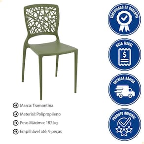 INFORMAÇÕES GERAIS DA CADEIRA TRAMONTINA JOANA NA COR VERDE OLIVA - Peso Máximo Recomendável: 182 kg - Fabricação: Polipropileno e Fibra de Vidro Injetado - Empilhável até: 9 peças