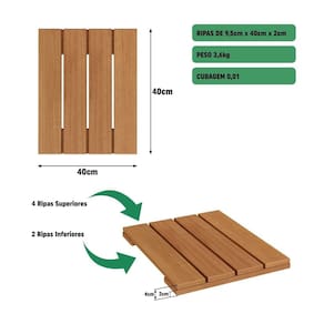 Deck de madeira maciça 40x40, ideal para áreas internas e externas, com acabamento na cor natural que destaca a beleza e resistência da madeira. Fácil de instalar, proporciona sofisticação e durabilidade ao ambiente, sendo perfeito para renovar espaços com elegância e praticidade. Escala de Brilho: Fosco Acompanha Barrote: Não Acompanha Ficha Técnica: Sim Acompanha Manual de Instalação: Sim Ambiente Principal: Jardim e Varanda Ambientes Recomendados: Área Comercial/Área Residencial Aparência: Madeira Composição: 100% Madeira Maciça Comprimento: 40 cm Cor: Natural Cor do Produto: Natural Espessura: 40 mm Informações Complementares: Conjunto de 4 Decks de Madeira Maciça, pode ser utilizado em diversos ambientes. Itens Inclusos: 4 Decks e Manual de Instalação Locais de Instalação: Médio Tráfego Local de Uso: Academias Manual de Montagem e Instalação: https://product-hub-prd.madeiramadeira.com.br/268399945/documents/22cc0c21-b46a-46ee-9e2a-a24b4e2194493074720127017526889443004.pdf Marca: Taty Móveis Material Principal: Madeira Material Secundário Construção e acabamento: Madeira Necessita Aplicação de Verniz: Não Origem do Produto: Nacional Peso: 14,4 kg Recomendações de Uso, Manutenção e Limpeza: Deve ser feita com pano macio e seco ou levemente umedecido com água e sabão neutro. Não devem ser utilizados abrasivos como palha de aço e objetos cortantes. Resistência à Água: Sim Resistência à Maresia: Sim Resistência a Risco: Alta Resistência ao Fogo: Não Resistência Química: Não Tamanho da Placa: 40cm X 40cm Tipo de Deck: Placa Tipo de Madeira: Eucalipto Tom de cor: Claro Marca: Não Informado