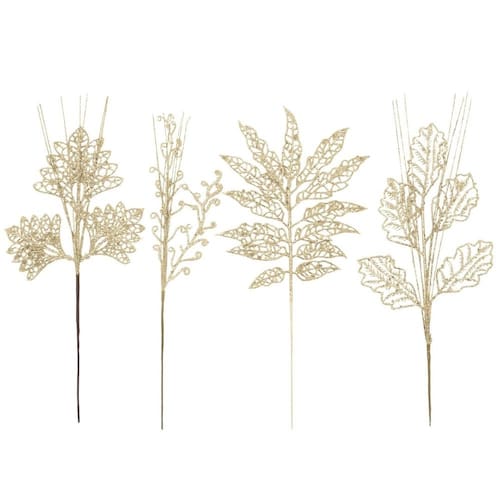 Kit 4 Galhos Natalinos Folhagem Decor Glitter Champanhe 30cm