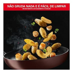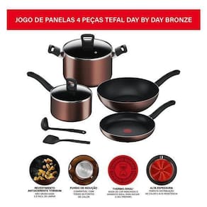 Praticidade, elegância e tecnologia Tefal em um só conjunto O Conjunto Titanium Bronze é ideal para quem busca desempenho superior e durabilidade, com design moderno e acabamento em tom bronze que traz sofisticação à cozinha. Diferenciais do produto: Revestimento antiaderente Titanium: alimentos não grudam e a limpeza é muito mais fácil. Thermo-sinal exclusivo Tefal: muda de cor indicando o momento ideal para iniciar o preparo. Base de indução: compatível com todas as fontes de calor - gás, elétrico, vitrocerâmico e indução. Alta espessura 2,4 mm : distribui o calor de forma uniforme e aumenta a resistência. Design moderno e funcional: acabamento bronze metálico que alia estilo e praticidade. Conteúdo da embalagem: Frigideira 24 cm Wok 28 cm Panela 18 cm Caçarola 20 cm 2 acessórios adicionais Revestimento interno: Titanium Revestimento externo: Antiaderente Base: Indução Perfeito para quem quer cozinhar com eficiência, segurança e um toque de elegância em cada receita. Marca: Não Informado Ean: 5603680340760