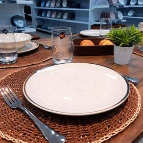Vento no rosto, o som do mar e a areia aos pés, assim é a brisa perfeita de verão. Pensando em trazer essa sensação para dentro de casa, a coleção Brisa recebe a decoração de pequenos detalhes em preto em todo a peça, representando os grãos de areia. As bordas de cada item da coleção recebem a aplicação de um fino filete na cor marrom, remetendo aos materiais naturais como o bambu e a corda. Inspirados na vertente do design biofílico que busca conectar as pessoas com os benefícios trazidos pela presença da natureza em ambientes e na criação de produtos, apresentamos uma coleção com inspiração natural, trazendo seus elementos mais representativos para um dia a dia mais tranquilo.