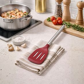 Os cabos em aço inox Elite Premium garantem firmeza, conforto no manuseio e longa vida útil. O design ergonômico proporciona melhor pegada e controle, tornando o preparo dos alimentos mais prático e eficiente. Todos os utensílios possuem furo passante no cabo, permitindo pendurar em suportes e manter a cozinha sempre organizada.