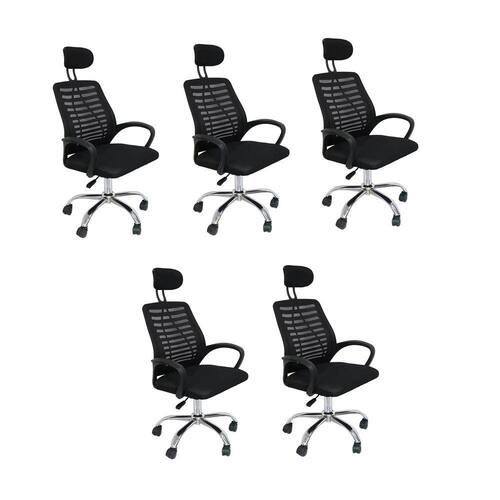 Conjunto com 5 Cadeiras office giratória com encosto em tela mesh, com braços em polipropileno e base em aço cromado. Possui regulagem de altura (mínimo 101cm e máximo 114cm), possui apoio para a cabeça, não possui função relax. Produto Montado: Sim Altura do assento até o chão: 39.0000 Ambiente Principal: Escritório Apoio para Braços Estofado: Não Braço com Ajuste de Altura: Não codigo_ean: 7909903422595 Complexidade da Montagem: Baixa: pode ser montado por uma pessoa sozinha Cor: Preto Cor do Produto: Preto Empilhável: Não Enchimento do Assento: Espuma D-20 Enchimento do Encosto: Espuma D-20 Encosto Reclinável: Não Giratória: Sim Informações Complementares: Conjunto com 5 Cadeiras office giratória com encosto em tela mesh, com braços em polipropileno e base em aço cromado. Possui regulagem de altura (mínimo 101cm e máximo 114cm), possui apoio para a cabeça, não possui função relax. Itens Inclusos: 5 cadeiras, Manual de Montagem e Kit Ferragens Linha ou Coleção: Cadeiras Office Manual de Montagem e Instalação: https://product-hub-prd.madeiramadeira.com.br/869973/documents/c73cbb5b-04fc-438b-83dd-07ccd2b4f9a0lofficecadiscomencostohb36.pdf Material da Base: Aço Cromado Material do Assento: Polipropileno Necessita Montagem: Sim Origem do Produto: Importado Peso: 7,9 kg Possui Apoio para Braços: Sim Possui Apoio Para os Pés: Não Possui LED: Não Possui Rodízio: Sim Recomendações de Uso, Manutenção e Limpeza: Recomendado apenas para uso residencial. Não expor ao sol ou umidade. Não exceder a capacidade de peso. Partes em aço cromado não possuem garantia em regiões litorâneas. Limpar com pano macio umedecido em solução de água e sabão neutro e secar em seguida. Para partes em aço cromado, limpar com flanela seca e macia. Para proteger a peça e manter o brilho sugere-se polimento com cera automotiva. Não utilizar produtos químicos ou abrasivos. Revestimento do Assento: Tela Mesh Revestimento do Encosto: Tela Mesh Rodízio com Trava: Não Rodízios Antirrisco na Base: Não Sistema de Montagem: Encaixe e Parafusos Suporta Até (kg): 90 kg Ean: 7909903422595