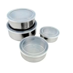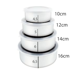 INFORMAÇÕES DO PRODUTO: Material dos Potes: Aço Inox Material das Tampas: Plástico Flexível Medidas: - 250ML 10cm diâmetro x 4cm altura - 430 ML 12cm diâmetro x 5cm altura - 690 ML 14cm diâmetro x 5,5cm altura - 1L 16cm diâmetro x 6cm altura - 1,5L 18cm diâmetro x 7cm altura