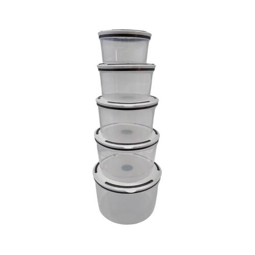 Dimensões: Pote 400ml: 6cm altura x 11cm diâmetro; Pote 650ml: 7,5cm x 13cm; Pote 1000ml: 8,5cm x 14,5cm; Pote 1500ml: 10cm x 16cm; Pote 2000ml: 11,5cm x 18cm Material: Plástico Peso total do conjunto: 420g Cor: Transparente com tampa Branca